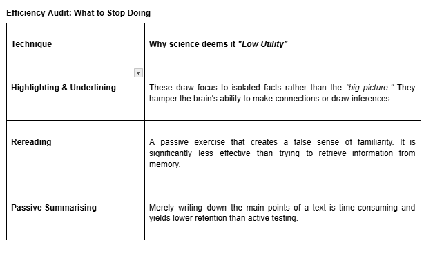 In a “highly anxious" state, the Reptile brain can hijack the system, shutting down the Primate brain’s ability to recall facts. By recognising where they sit on the spectrum of "Teenagers’ Attitudes to Exam Revision" - whether they are feeling "Not Bothered," "Last Minute Cramming," or "Super Stressed" - students can use the techniques below to settle the "Reptile" and re-engage the "Primate." To make room for high-impact habits, we must first clear away low utility techniques. These are often the most common habits because they feel productive… but science tells a different story.
